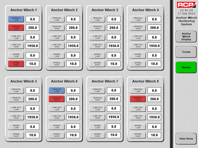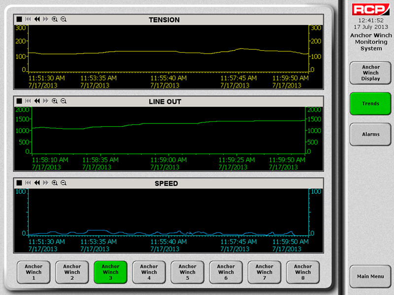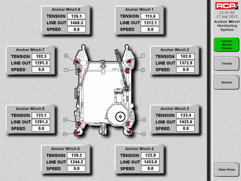 A simplified overview graphic of the anchor winches information is used to offer precise information of the system allowing for rapid intervention if required.
