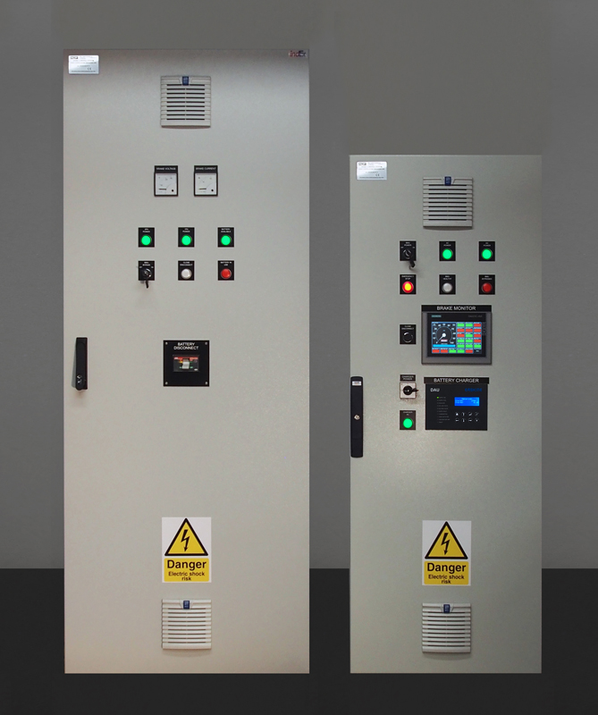 The RCP brake controller utilises modern power electronic components to rapidly supply 250 volts DC to the auxiliary brake coils in response to an input voltage derived from an intrinsically safe brake handle. The brake controller is a highly responsive system which delivers power to the coils in a controlled and linear fashion across all ranges. Power for the system is derived from a three phase full wave silicone controlled rectifier assembly supplied by a 30KVA, 60Hz 440VAC 3 phase transformer.